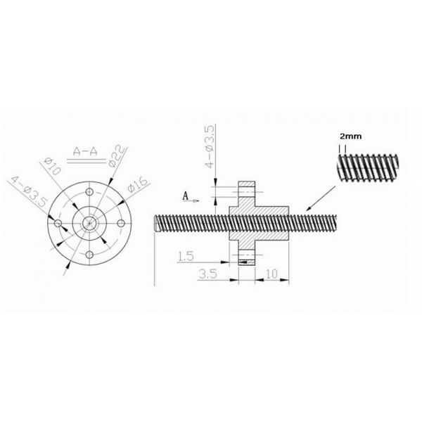 Vite trapezoidale in acciaio INOX ad un principio con diametro esterno 8 mm, passo 2 mm e lunghezza totale di 500 mm completa di madrevite flangiata in ottone con 4 fori di fissaggio da 3,5 mm. Ideale per la movimentazione lineare degli assi di CNC, stampanti, ecc.